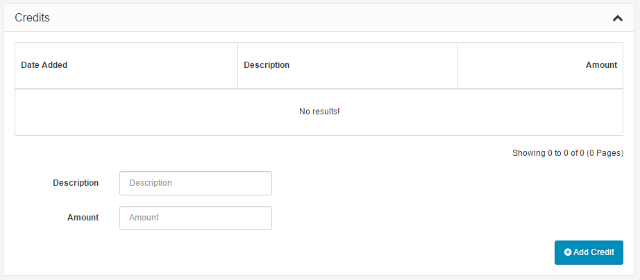 The Credits tab is where you may manually add a credit to the customer. To do so, enter in the description of the credit, the amount paid, and click "Add Credit". Every credit added will be listed in the Credits tab.
