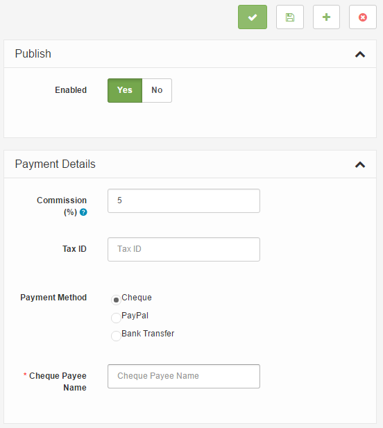 The Payment Details tab configures the commission and payment methods to be paid to the affiliate: