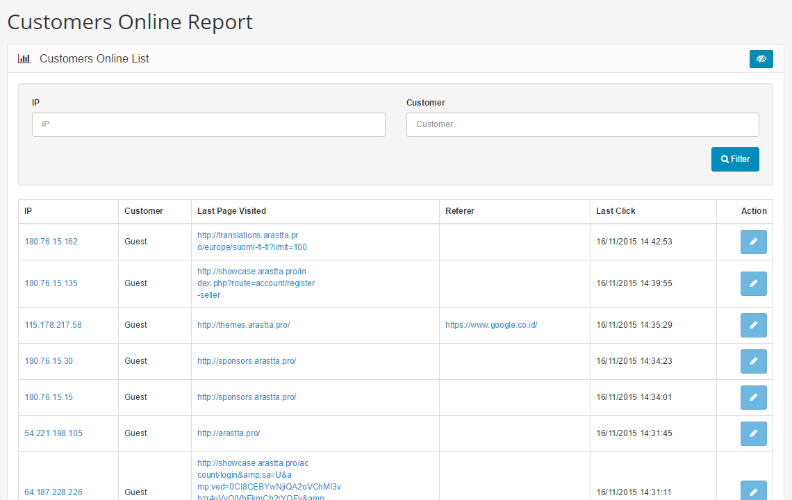 The report will position the latest activity first. The user will be tracked even if he/she is not yet registered in your store, and will be named as Guest. It will record his/her IP, the last page has visited, the reference page that came to your store, and the last click date & time.