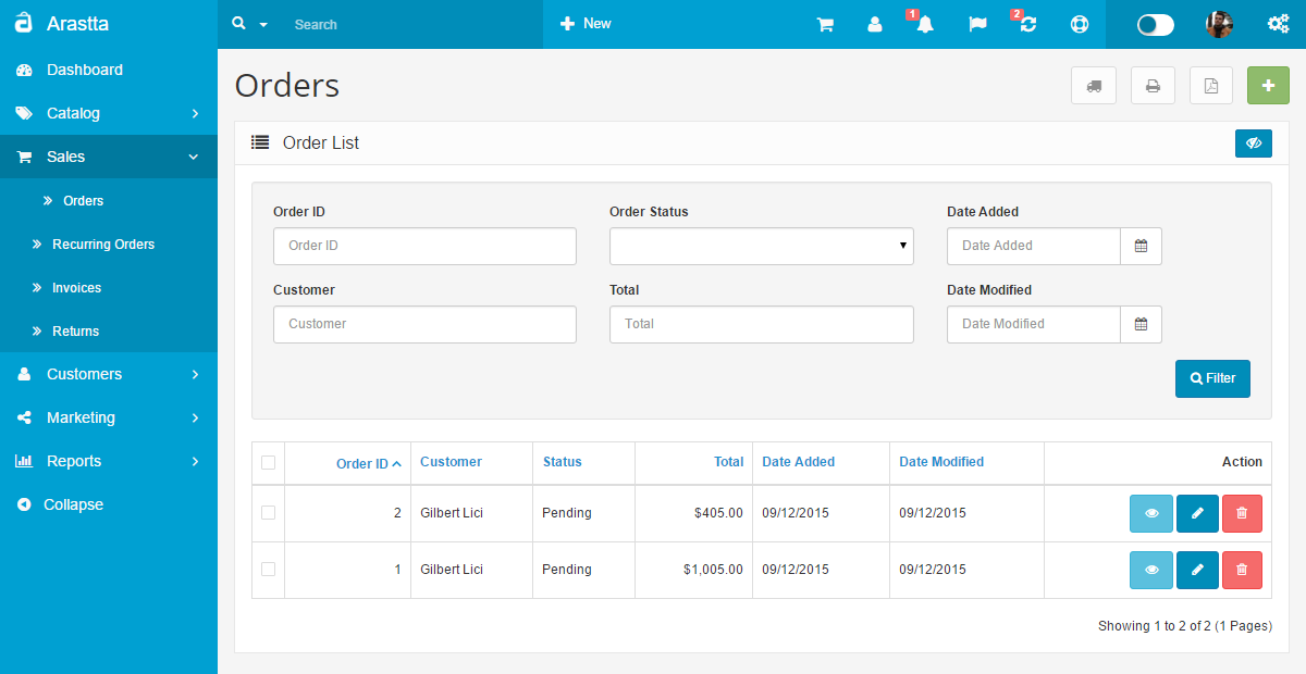 Customer Orders will be automatically updated to the Order section after a customer confirms checkout. Though it is automatically updated, you may want to edit or add orders manually to add new information such as a gift-voucher, or add reward points. To manually add a new order, click the "Add New" button. To modify a pre-existing order, click "Edit" under Action.